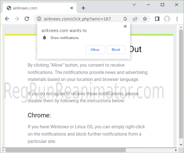 The "Airknees.com" website relies on aggressive tactics to distribute its notification spam, including using misleading tactics to trick users into allowing notifications.
