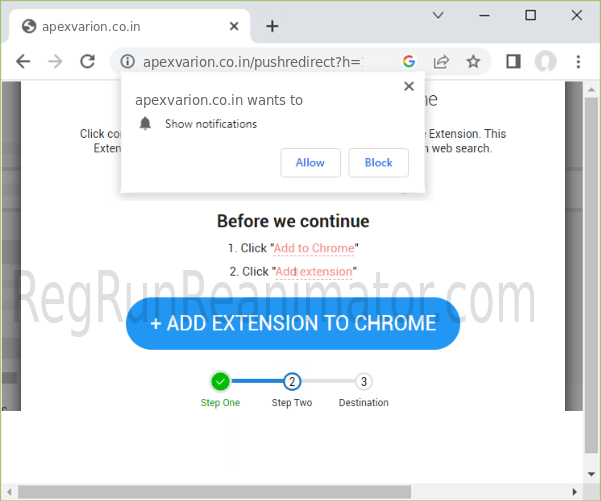 The "Apexvarion.co.in" website relies on aggressive tactics to distribute its notification spam, including using misleading tactics to trick users into allowing notifications.