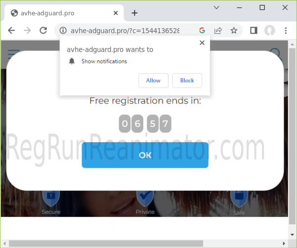 AVHE-ADGUARD.PRO is a malicious site that tricks you into subscribing to its notifications to bombard your device with spam later.