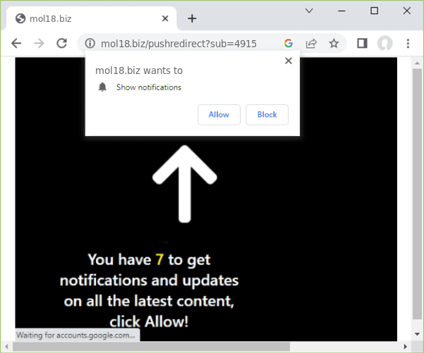 MOL18.BIZ is a malicious site that tricks you into subscribing to its notifications to bombard your device with spam later.